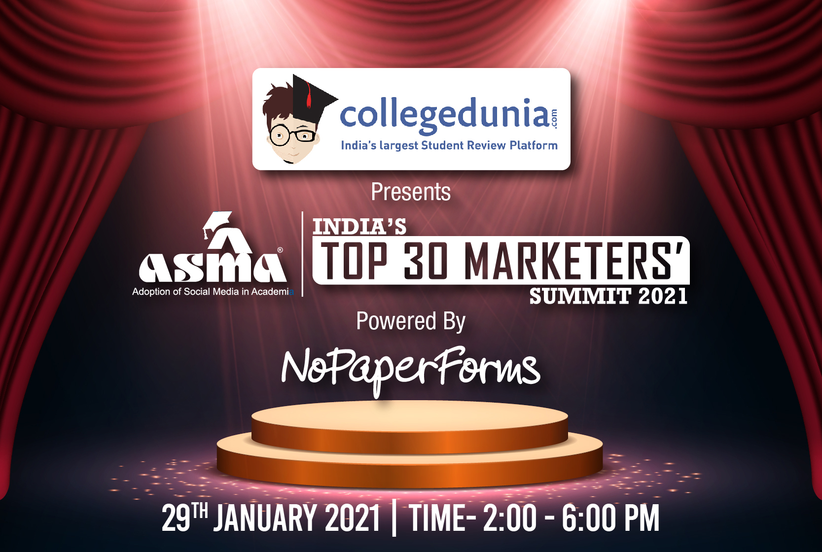 ASMA India’s Top 30 Marketers’ Summit 2021, presented by Collegedunia and powered by NoPaperForms was held on 29th January 2021. ASMA’s flagship event saw a gathering of top marketers from academia discussing trends, innovative ideas, and sharing best practices in digital marketing.