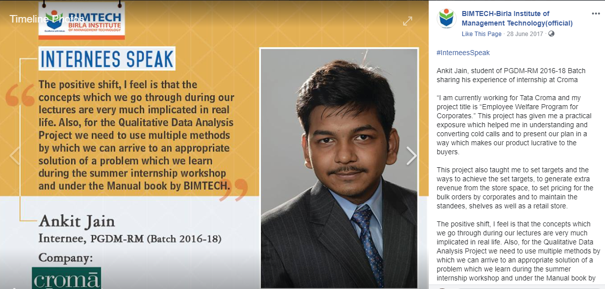 With more than 2 lakhs likes over the official page of BIMTECH, leveraging Facebook as a platform to highlight the student’s summer internship projects is in synch with what was the objective of the campaign.