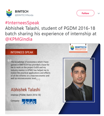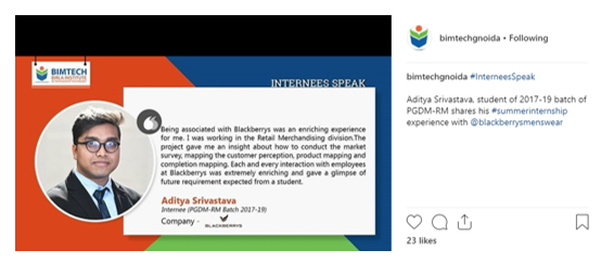 The hashtags #Interneespeaks aims to share students experience during SIP and how successfully they have been able to contribute to the organization. It gives a strong impression among recruiter about the quality of students and their integrated learnings at the esteemed organization. This builds a strong brand image of the Institute to bring high corporate exposure for students.