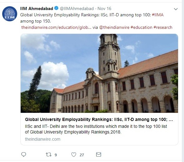 Most of the top institutes have adopted the simplest way to brand themselves through posting about where they stand in the competition. It not only creates #brand equity but also brings #credibility to the academic standard of an Institute. IIM Ahmedabad, the world-renowned institution also capitalizes the power of social media by sharing the success on its #twitter wall.