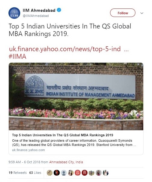 It has started sharing its global ranking on Twitter with #IIMA along with link description below in each post on twitter. IIMA is very active on Twitter, posts frequently on the wall. With this large network of 1,58,105 followers where tweets have reached over 2200, tap on its strategy to share and reach globally is in the right direction.