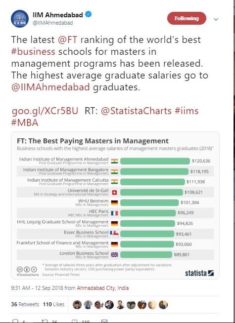 IIM Ahmedabad has shared with its followers on Twitter about Global University Employability Ranking, QS Global Ranking, FT Ranking on World Best #Business Schools for Master in Management Programs, and publishing this on twitter wall will make its existing students extremely proud to be a part of such esteemed and integrated institute.