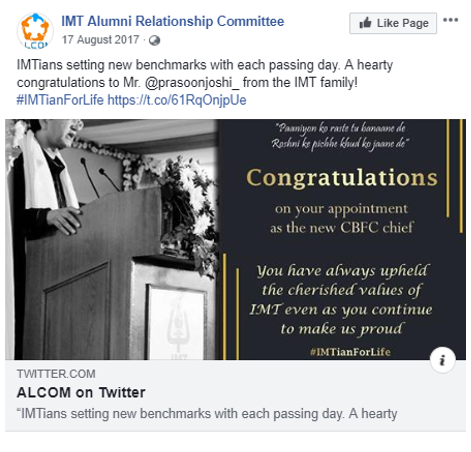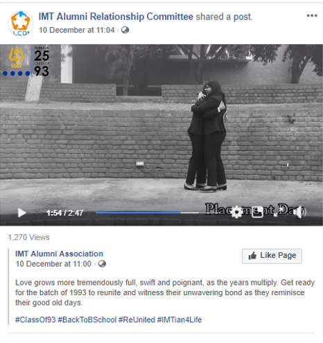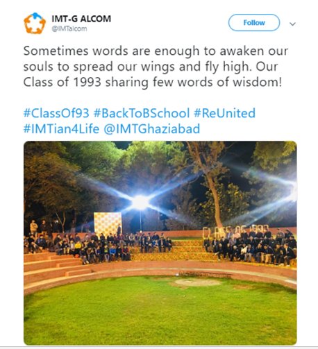There are more than 270 million people active on Facebook. Thereby, connecting engaging with the alumni over Facebook is the more easy and right way. IMT has an official Facebook Page “ALCOM” specially dedicated to managing alumni relationship. The short videos with a storyline about the campus journey, makes the alumni feel nostalgic