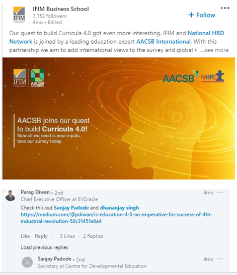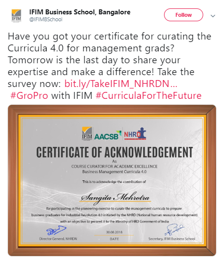 The strategic approach was clear with objective to promote IFIM-NHRDN survey, increase industry participation to build curricula 4.0 for the future. The approach was straight and simple to reach out audience over LinkedIn, Twitter, Facebook, provide certification for curating the curriculum 4.0. This unique initiative was aim to bring the best of pedagogical development in higher education.