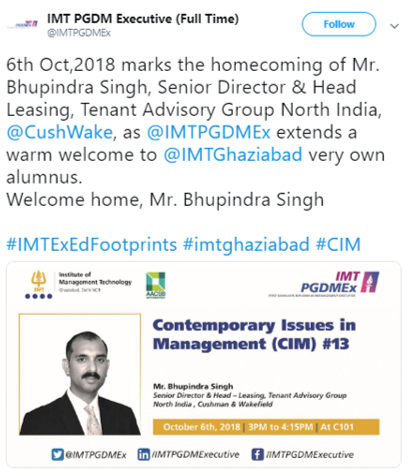 To Promote and increase IMT PGDM Executive brand value by organizing various industry connect series like Expanding Horizons, Leader Speak Series and Contemporary Issues in Management, attended by eminent Industry stalwarts. Each event had pre-campaign and post-campaign. Information influx from relevant industry leads to the poster and content creation.