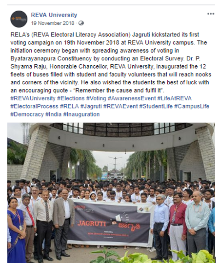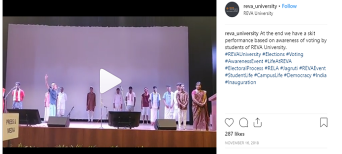 With the significant chunk of the young audience over social media, REVA university started a campaign to increase awareness about the voting rights of students. The campaign maneuvered the voting rights of students and creating awareness about adult franchise by organizing camp and skit.