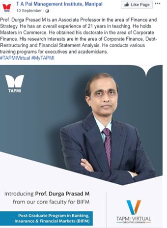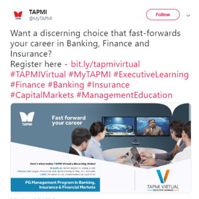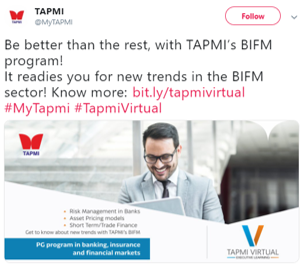 Majority of the Institute in India has started these certification courses including Edu-tech companies but what is more important, is whether your target audience knows about courses offered by you? More importantly, your presence over digital media is vital to drive up applicants for these courses. TAPMI makes it more vibrant over social media to reach to right audience.